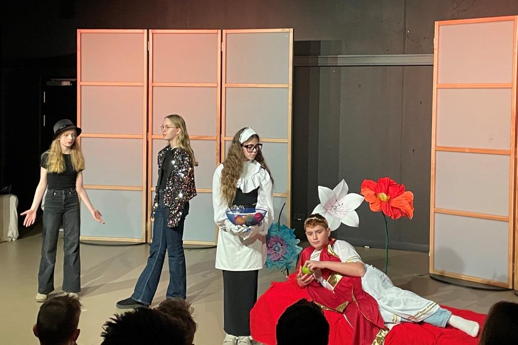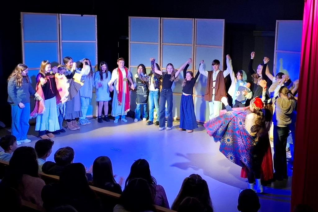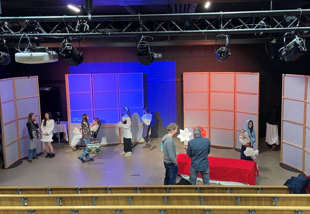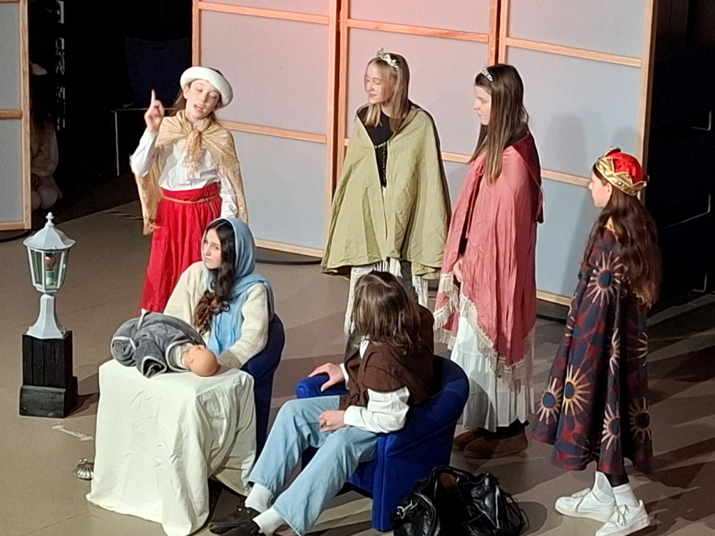 Viel Zeit blieb nicht, sich auf der tollen Studiobühne einzurichten, denn schon bald stand die erste Aufführung vor Schülerinnen und Schülern der Jg. 6 an. Die Ursels überzeugten durch Textsicherheit und Spielfreude und wurden mit kräftigem Applaus vom Publikum dafür belohnt. Für einige Lacher sorgte die Szene, in der Mary (gespielt von Arya, Nela und Emilia) angewidert eine Ratte aus der Herberge in Bethlehem ins Publikum warf und diese dann prompt zurück auf die Bühne geworfen wurde. So war also das Eis gebrochen, und auch in der zweiten Aufführung des Tages, dieses Mal vor der Jg. 7, hatten sowohl Schauspielerinnen und Schauspieler als auch das Publikum viel Spaß, was nicht zuletzt an dem Schäfchen (dargestellt von Katharina) lag, das dem hungrigen und alles andere als vegetarischen Engel (Anna-Maria, Daria) gerade so entkommen war. Am Ende freuten sich (fast) alle mit Mary und Joseph (Marlon, Bastian) über die glückliche Geburt von Baby Jesus. Für Augustus (gespielt von Timur) zählte allerdings natürlich nur die Volkszählung und sein Geld.