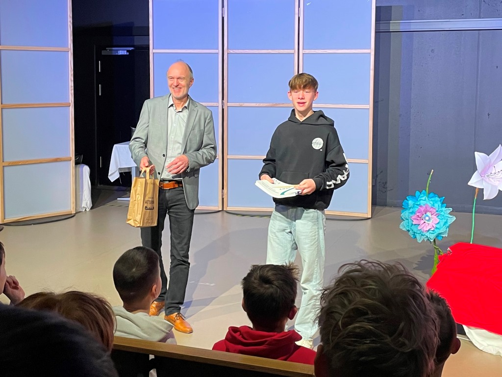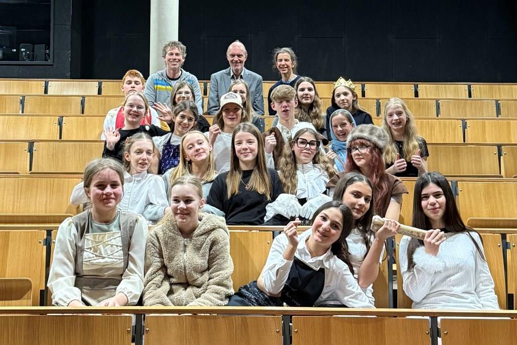 Unterstützt wurde die Theater-AG von zwei Q1-Schülern aus dem Technik-Team der Hildegardis-Schule, auf die stets Verlass war. Herr Schomaker führte die Gruppe in der Pause auch durch das Schulgebäude, bevor alle zu einem gemeinsamen Essen in der Schulmensa eingeladen waren.